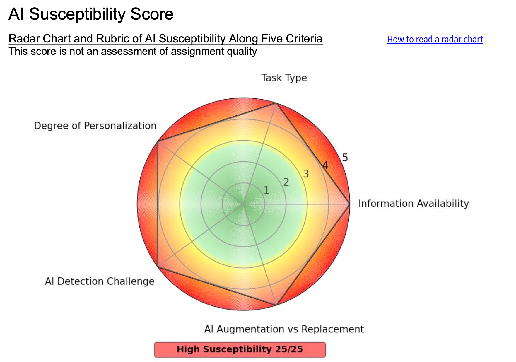 The team developed a model based on five criteria, offering each assignment a score out of 25 to indicate its vulnerability to AI. Lower scores indicate greater resistance to misuse; higher scores show susceptibility to AI misuse.