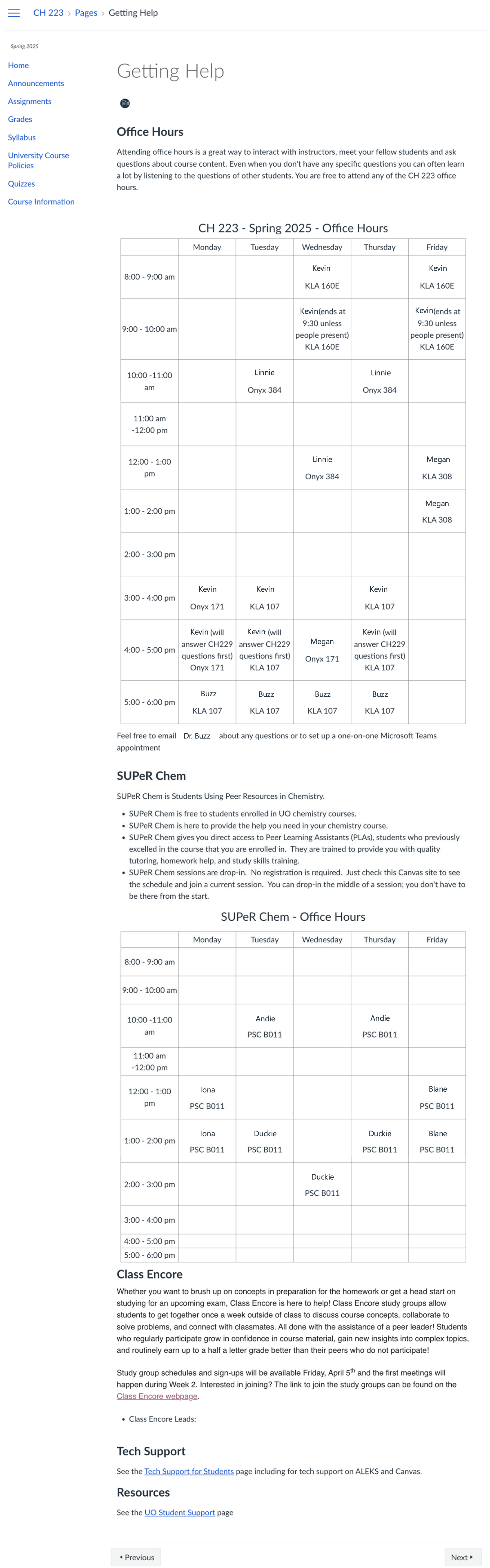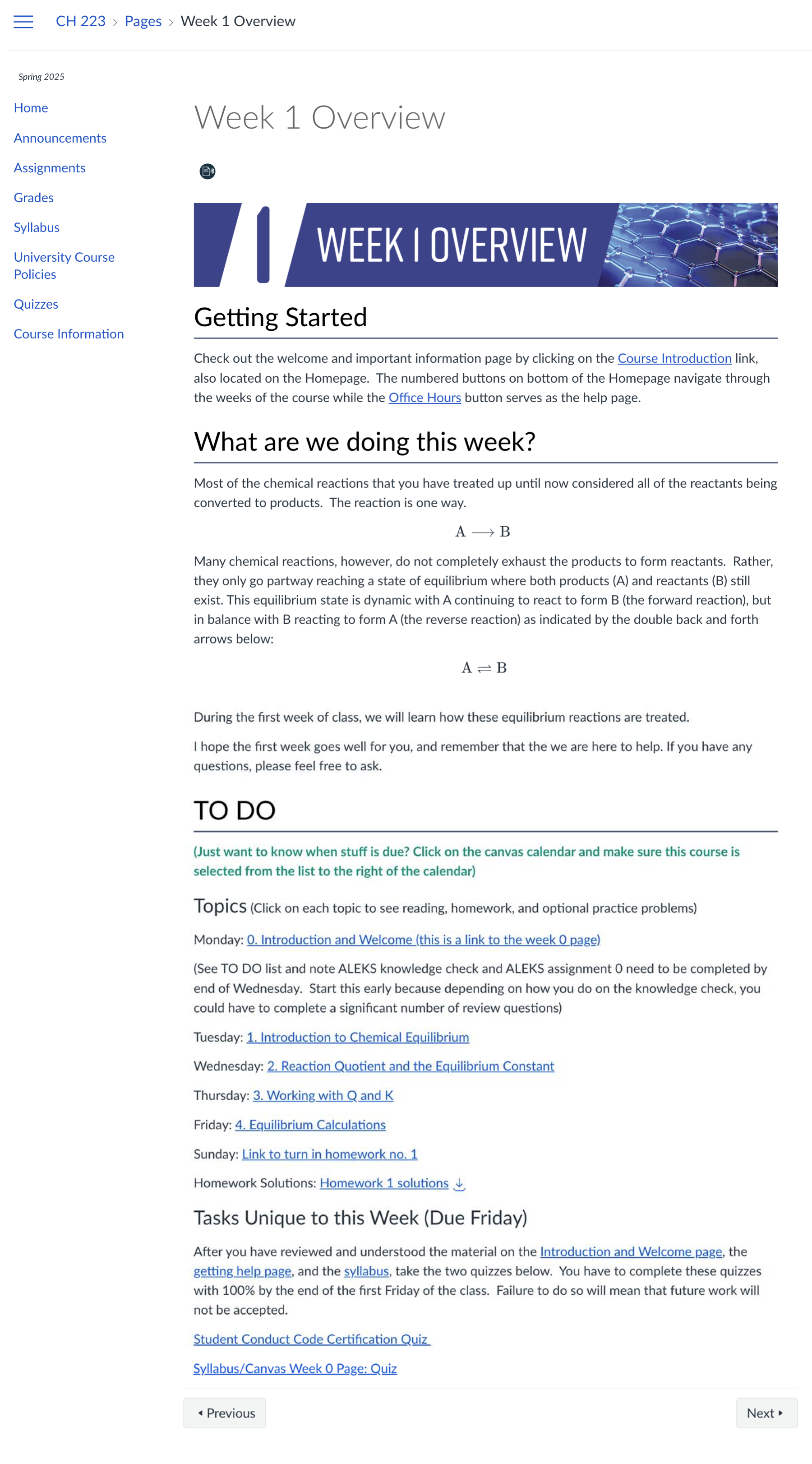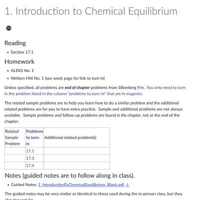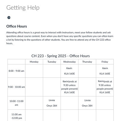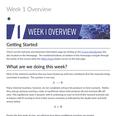 A chemistry instructor used a page for each weekly and for each class, instead of a weekly module structure. Because the class meets 5 days a week, this structure condensed information and focused it for students rather than having a very lengthy module page. To provide one direct route for Canvas site navigation, the instructor hid the modules pages from students entirely.