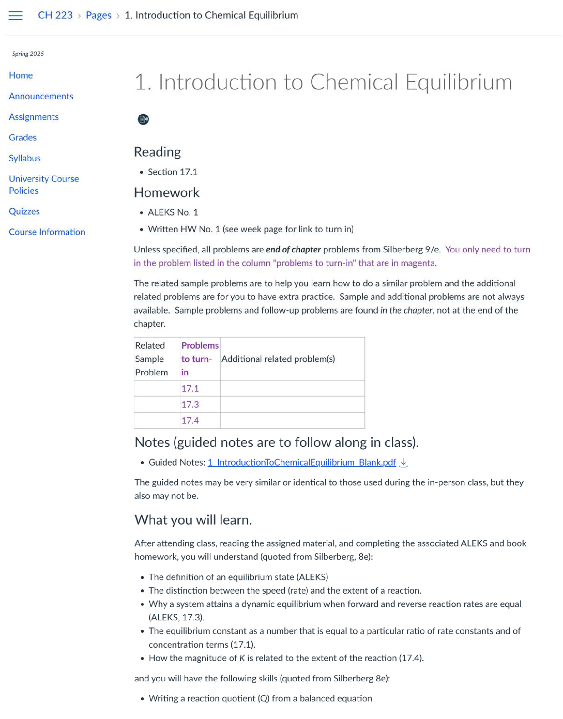 These pages for each class session tell the reading, homework, partial notes, and learning objectives for each class.