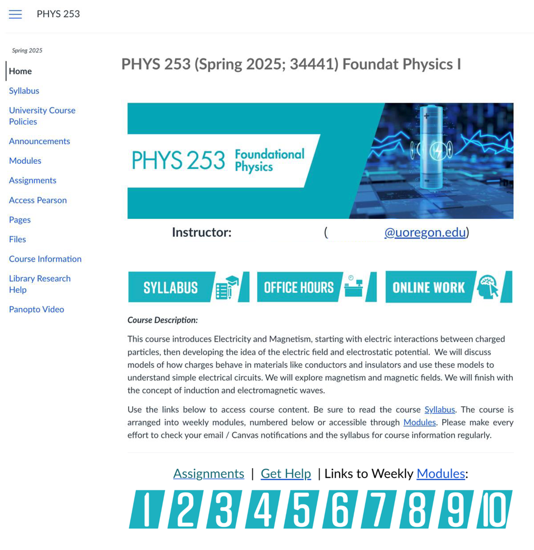 This focused page shows students quick links to key information (syllabus, office hours, online homework), a course description, and gives links to weekly modules.
