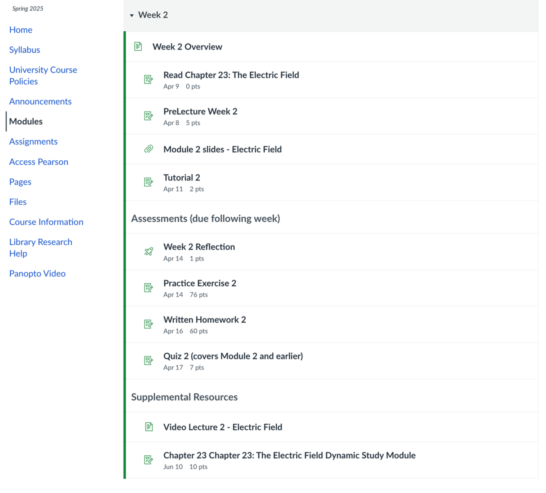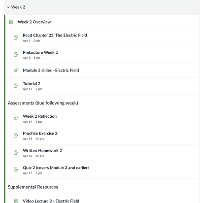 Each week's module is arranged with content information, assignments, and supplemental materials. Notice the indentation to signal grouping of material within the module. The first item in each module is an weekly overview page.