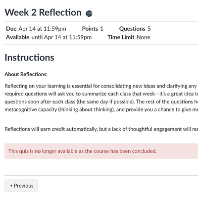 This instructor uses these reflections to spur metacognitive thinking in their students (another REGS menu item!). At the start of each week, they open class with insights by students from the previous week's reflections.